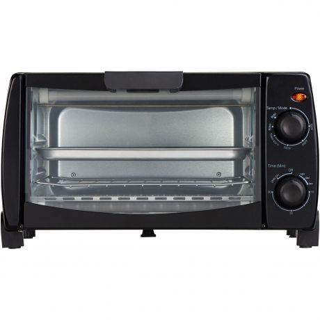 Create tasty snacks with this Mainstays 4-Slice Toaster Oven. It features two quartz heating elements that produce 1,000 watts of power. The black kitchen toaster oven comes with a baking rack and a pan. It also features easy-to-use controls for time and temperature and a power indicator light. This model can be used to toast, bake or broil.